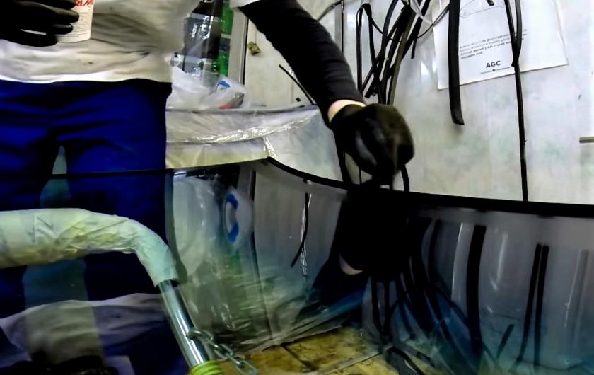 - Первым делом необходимо демонтировать старое, поврежденное стекло. Для этого снимаются боковые и верхний молдинги, само стекло срезается с кузова при помощи спец-инструмента
